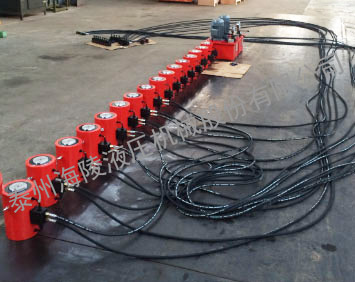 我公司設計制造的(PLC)同步千斤頂廣泛適用于大型建筑工程設備,構件的同步起頂、調整及鐵路、公路、橋梁工程的架設。它可根據現場(chǎng)的實(shí)際情況選配不同規格、型號、數量的超薄型JRSM系列、薄型JRCS系列、大噸位DYG系列10T、20T、30T、50T、100T、150T、200T、320T、500T千斤頂。以及配備1.1KW、2.2KW、3KW、4KW、5.5KW、7.5KW、13KW等不同規格的泵站,同時(shí)配備不同長(cháng)度的高壓油管和合適的分配閥,采用一泵拖多頂的方法以滿(mǎn)足適應施工現場(chǎng)的作業(yè)要求。